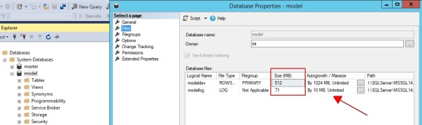 To get around this, toggle over to SQL Server Management Studio and change the file settings on the model database. In my case, they were set to 1024 MB, 512 MB (Logs), and 512 MB autogrowth.